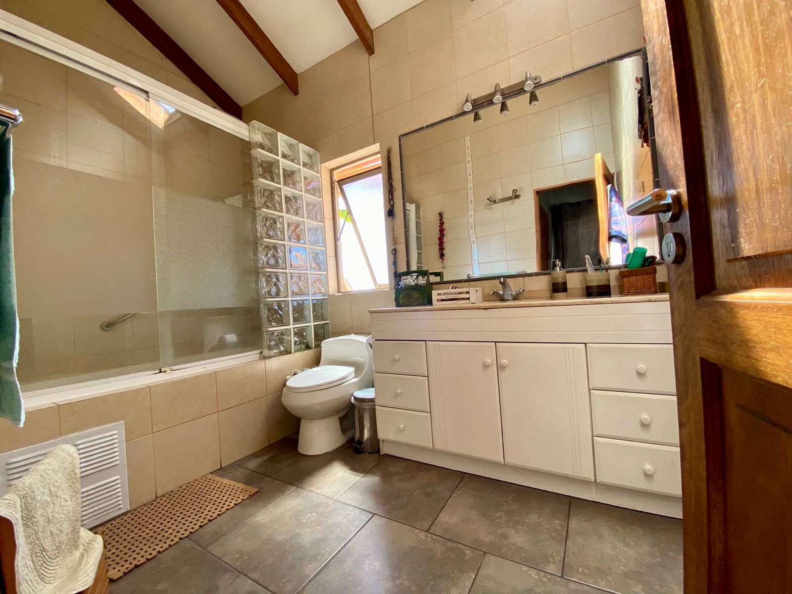 Pieza Principal en suite y Walk-in Closet. Baño con jacuzzi, piso de porcelanato y vigas a la vista.