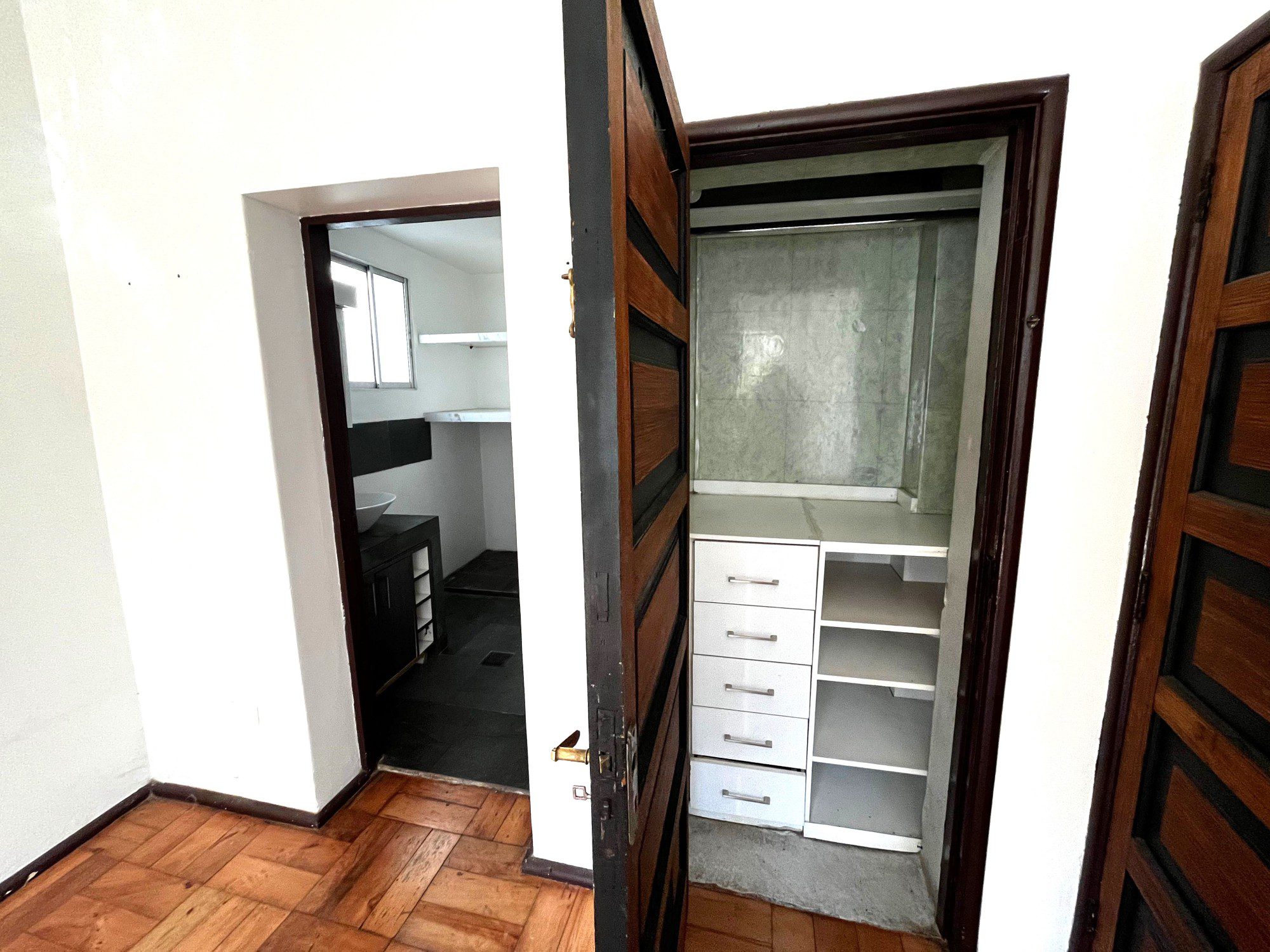 Un dormitorio en suite con baño remodelado. En el baño está la conexión para la lavadora de ropa.